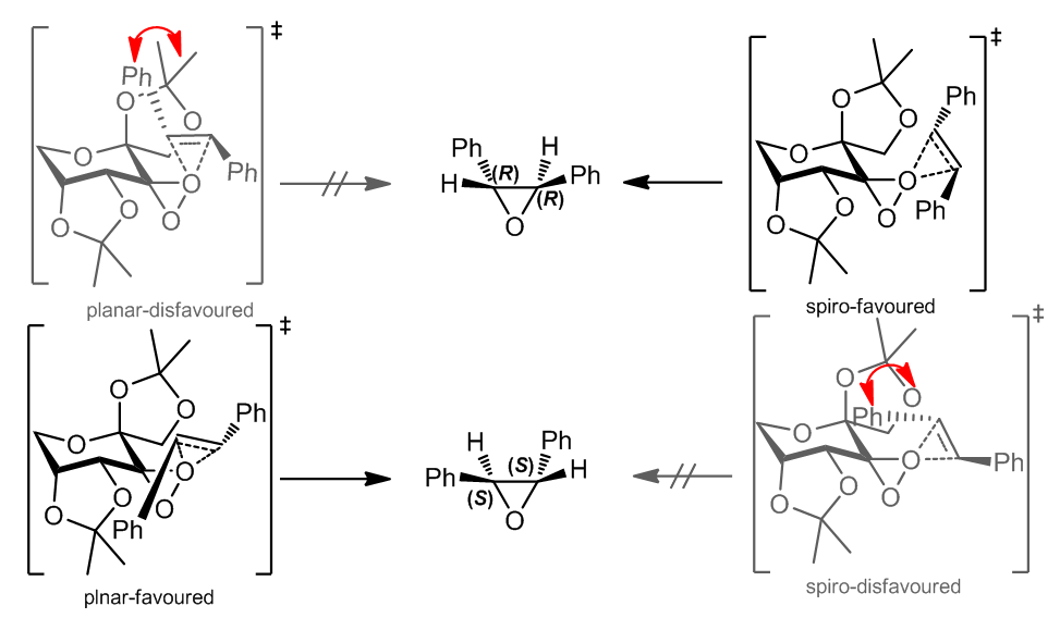 过氧丙酮进行环氧化反应时发现,顺式双键的反应活性一般要高于反式双键,可能的原因是此类反应是通过螺型过渡态进行的。相同地,史一安环氧化反应的过程中,手性酮会经历一个过氧丙酮类似物的中间体,这个中间体再对烯烃进行环氧化反应,反应过程中可能是螺型过渡态,但是通常时候是平面型过渡态占主导,因为普遍认为螺型过渡态是电子丰时的过渡态,因为氧原子孤对电子和烯烃的π*轨道只见的相互作用,但是史一安的环氧化反应中底物越缺电子则越有利于反应的发生,因此更加可能是平面型过渡态发生反应;此外,反应的产物大多是(R,R)-构型的,这更加支持了反应的过渡态的理论。