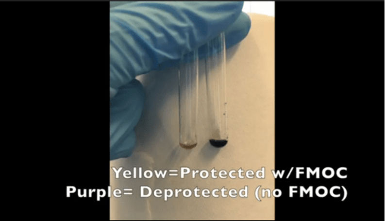 - 如果清洗3次后的树脂呈现红色至褐色则表示存在未反应的末端氨基,如果树脂呈现出无色至黄色,表示缩合反应已经全部进行完毕。