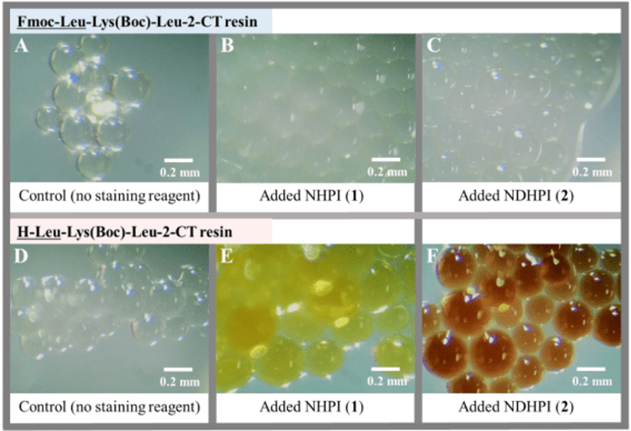 这是一种新的检测方案,可以可逆地对树脂进行染色。NHPI试验可以检测出含有任何级数氨基的氨基酸,且氨基酸种类不受限制。而且不需要担心用到Kaiser test时用到的剧毒物氰化钾(KCN)带来的的危害,并且用于做试验的树脂可以回收利用由此不会影响总收率。该方法相比Kaiser test方法而言改善了很多。