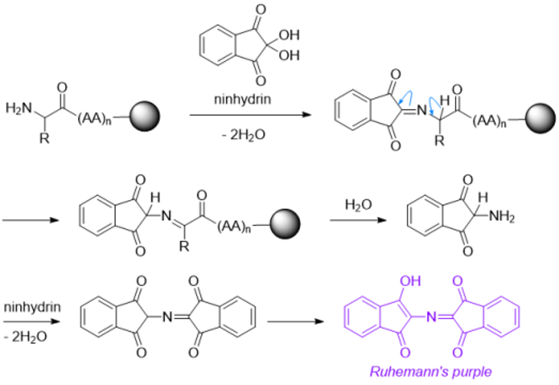 Kaiser Test的原理是固相上的茚三酮显色反应,该分析方法相当于检测出末端氨基。茚三酮与氨基反应产生一种Ruhemann’s purple的色素。测试过程中加入苯酚是为了调节PH值,KCN的作用是还原剂,是为了防止中间体被空气氧化[3]。