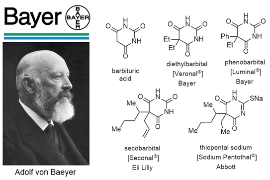 首先介绍的是巴比妥类药物(Barbiturates),在巴比妥类药物发现之前,治疗精神疾病主要依赖麻醉剂和酒精。德国化学家AdolfvonBaeyer利用丙二酸与尿素最先合成了一种新物质巴比妥酸(BarbituricAcid),虽然当时Baeyer并没有将其作为药物使用的意识,但他还是合成了一系列的衍生物,直到1903年EmilFischer和他的同事JosephvonMering发现了巴比妥衍生物具有镇静安眠的潜在药用价值,随即巴比妥就被商品化,作为安眠药广泛使用(如图1所示)。