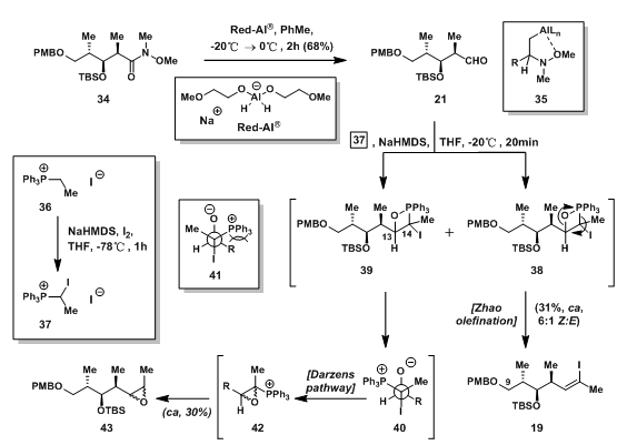 正如图6所示,碎片19的制备只需要两步,但是却遇到了许多麻烦。首先34被红铝还原成醛基,得益于weinreb酰胺的氧原子与Al原子配位形成稳定的四面体中间体35,使weinreb酰胺不会被还原成羟基;36先碘代生成37,37再与21反应,生成19。21与37反应时,Smith发现会有环氧化合物42的副产物生成。他们猜想,在两者反应时,有38与39两种中间体生成,38发生Zhao Olefination生成19,但39的O-P键瞬时断裂生成41所示结构,并且由于大基团相互作用,生成的氧负离子会发生Darzens-Type反应,离去I离子,生成环氧盐42,随后质子化生成43。虽然生成的19只有31%的收率,但是此反应可以大量反应,可以忍受其偏低产率。