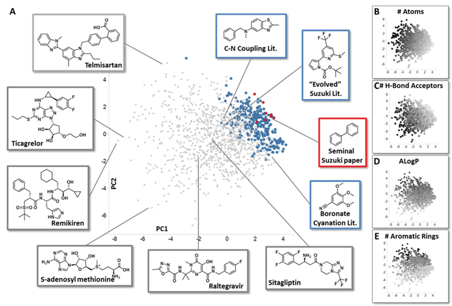 Fig.1 利用Principal component analysis (PCA)对小分子药物(灰点)和文献报道的Suzuki–Miyaura以及Buchwald–Hartwig产物(红点以及蓝点)在原子数,氢键受体数以及ALogP等参数上综合处理后得到的物理化学空间的可视化图景