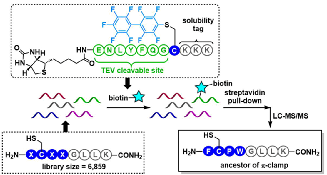 Pentelute等人选择在那些在N的末端具有半胱氨酸(Cys)同时在C的末端具有“π-钳”序列,并且可以被TEV蛋白酶切割开的蛋白质作为模型进行研究。结果证实只有那些含有“π-钳”的半胱氨酸(Cys)被选择性地修饰了。