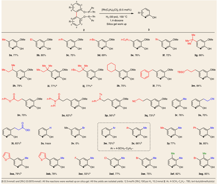 2018年,董广斌报道了一种在2,2′-biphenols(BINOL)中非张力的C(aryl)–C(aryl)键的活化。该方法的关键是利用羟基作为位点,将导向基配体磷酸酯引入体系,通过与金属Rh配位后活化C-C键,并用H2作为还原剂,得到苯酚衍生物。该方法具有低的催化剂负载量和好的官能团耐受性,并且可用于合成2,3,4-三取代苯酚。机理研究表明C-C键活化步骤是由Rh(l)-H物种催化的。