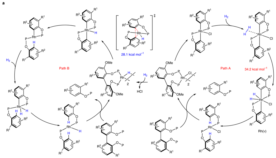 随后作者根据之前报道的文章,猜测可两种可行的机理(图2a)。Patha: Rh(l)-Cl直接对C-C键进行氧化加成,得到双芳基Rh(lll)物种,随后再与H2氧化加成,随后两次还原消除得到产物,因此,patha经过一个Rh(V)物种。Pathb: Rh(l)-Cl先于H2反应得到Rh(l)-H物种,它比Rh(l)-Cl更富电子,更有可能作为真实的催化剂,Rh(l)-H经过C-C键的氧化加成得到Rh(lll)物种,随后还原消除得到一个产物和芳基Rh(l)物种,随后与H2氧化加成,在还原消除得到另一分子产物和活性催化剂Rh(l)-H物种,因此,pathb只包含Rh(I) and Rh(lll)中间体。