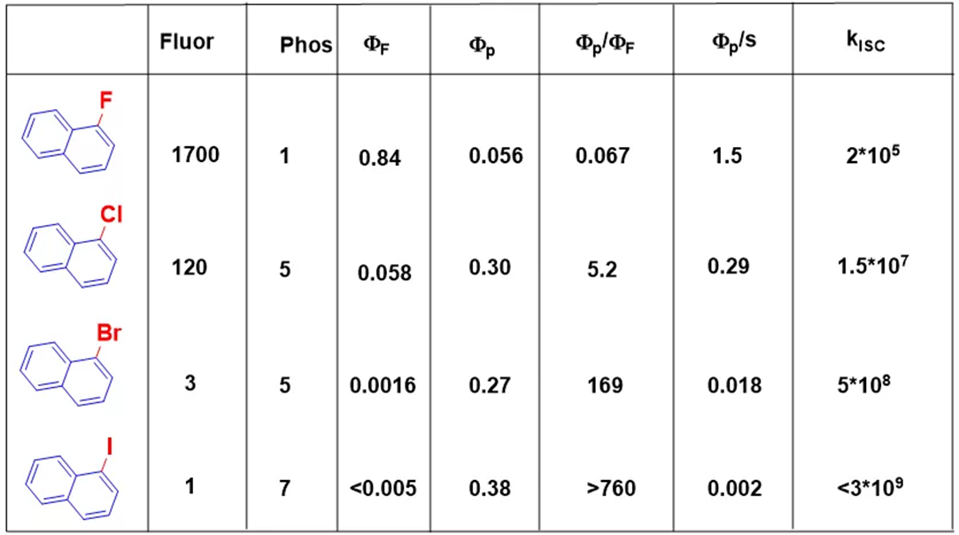 体系内引入重原子从而增加了磷光量子产率现象也被称为重原子效应:是Macclur1949年提出的。下图显示的是α卤代萘的重原子效应图表,最主要的对比是