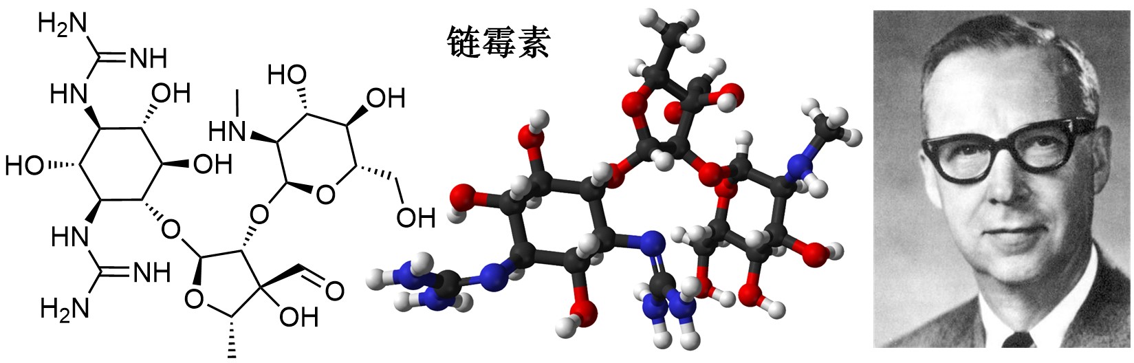 链霉素被发现后不久,动物和人体试验的结果非常令人振奋:链霉素对抗结核杆菌效果显著,皮肤、骨、肺、脑膜、关节等多种形式的结核病都可以被链霉素抑制,并且链霉素对多种动物没有毒性。在当时人们对结核病束手无策的情况下,链霉素无疑成了最后一根救命稻草。尽管师徒二人提取出了链霉素,可他们对链霉素的化学结构一无所知。当时Merck公司的福克斯(Karl August Folkers)博士在缺乏核磁共振技术等现代仪器的情况下,凭借无与伦比的化学知识储备对链霉素进行了一系列的官能团衍生、化学降解,并很快确定了链霉素的化学结构。