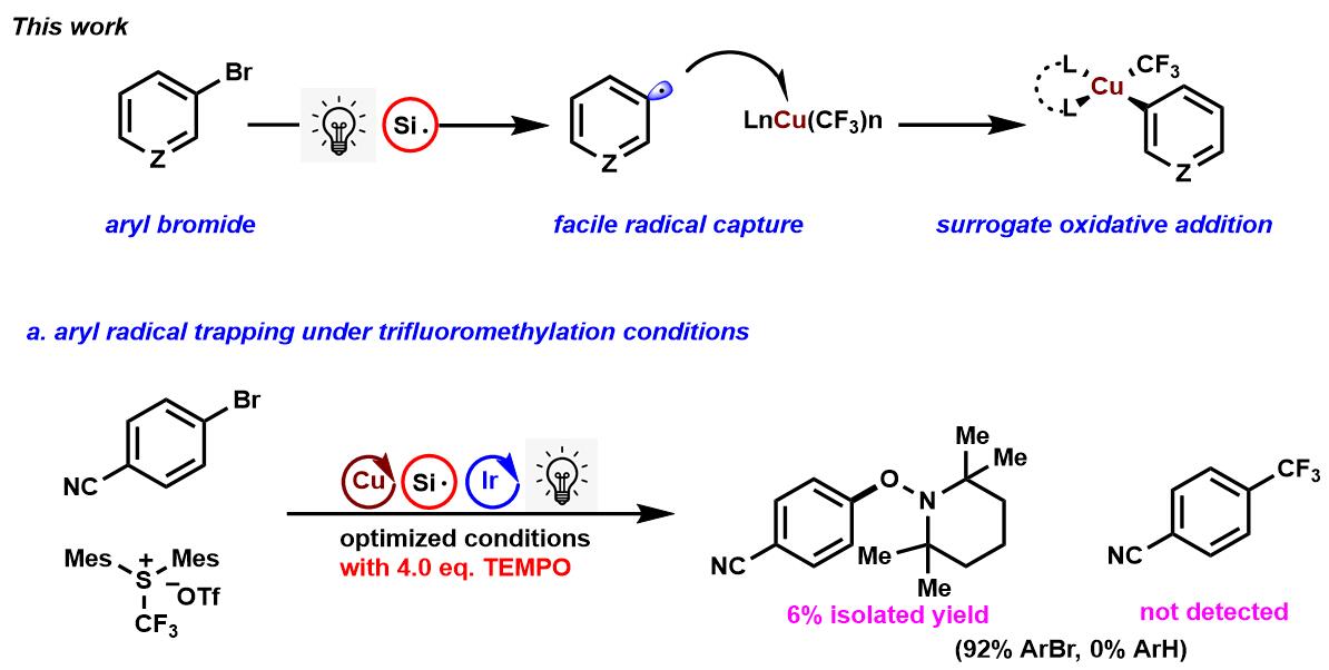 2018年普林斯顿大学的默克催化研究中心17的David W. C. MacMillan教授小组在《Science》发表了题为“A radical approach to thecopper oxidative addition problem: Trifluoromethylation of bromoarenes ”(通过自由基来解决铜氧化加成中问题的根本方法:溴代芳烃的三氟甲基化)。文中,MacMillan教授在反应中加入自由基捕获剂TEMPO,发现主反应被明显抑制。(Fig. 3)