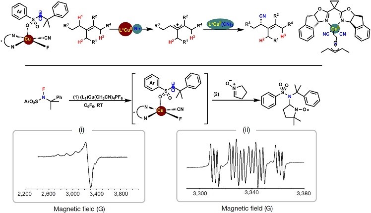 2019年上海有机所得刘国生研究员课题组在《Nature》上发表了题为“ Site-specific allylic C–H bond functionalization with a copper-bound N-centred radical “(精准剪切铜催化的烯丙位C-H键选择性官能团化)19。文中,刘国生研究员猜想Cu(II)可以与含有磺酰胺结构和双齿配体的N-中心自由基(NCR)结合。为了验证这一猜想,进行了EPR测试,监测到N-F试剂对 (L1)Cu(I) 的氧化,得到了Cu(II)信号(Cu (II) EPR信号)(Fig. 7 (i)),通过自由捕获试剂DMPO试剂也探测到NCR(Fig. 7(ii)).