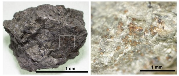 图1 火星陨石ALH 84001的岩石碎片(左)以及局部放大图(右)