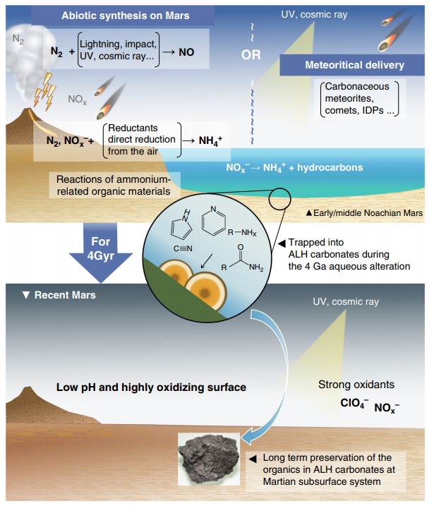 近日,ELSI-JAXA联合团队使用了最先进的分析技术来研究ALH84001碳酸盐的氮含量,并宣布他们已经找到了火星40亿年前存在含氮有机物的可靠证据[1]。