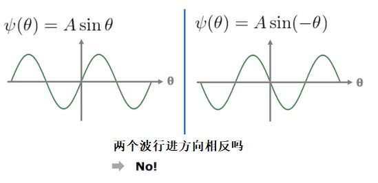 乍一看可能会觉得这两种波行进方向好像是相反的呢,似乎三角函数也能表示波的方向呢。但是细想觉得不对,如果把sin x表示的波向左或向右平移π个单位,就会和sin (-x)的波相重合。也就是说这两个图只是初始相位不同而已,实际上它们是相同的两种波。