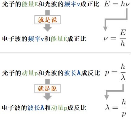 第一个等式的右边的频率v和波长λ这两个物理量都是波的特有物理量。这两个波特有的物理量对应于粒子特有的两个物理量——一个个光子的能量E和动量p。也可以这么理解,电子具有的波的性质的物理量v和λ可以用电子的能量E和动量p来表示。