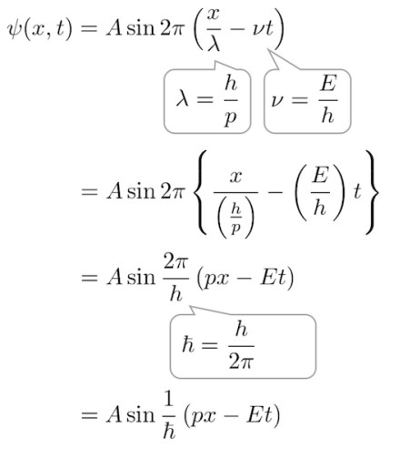用动量和能量来取代正弦函数中的波长和频率,之后对正弦函数求偏导得到有关力学能量的方程。接下来让我们逐一推导。