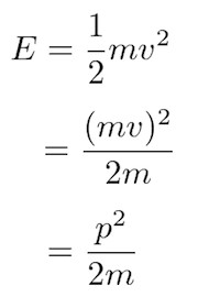 但是,Step 3中的波的式子中使用的不是速度v而是动量p。所以动能方程中要也要用p来替换v。因为p=mv,所以粒子的能量可以用下面的式子表示。