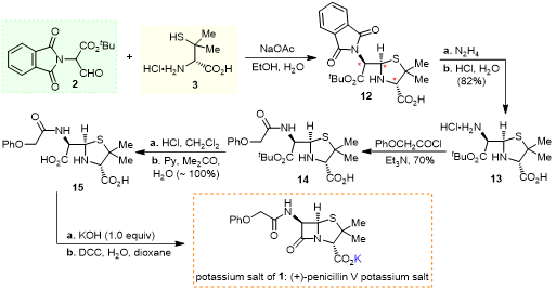 随后,在NaOAc和EtOH组成的缓冲体系中,中间体3的氨基和巯基均亲电进攻中间体2的醛基生成中间体12。有意思的是,反应过程中羧基所在碳原子的构型得到保持,但分子中还存在另外两个手性碳原子,因此理论上应该得到四种手性异构体,但实际上该反应仅获得了酯基所在手性碳原子处的两种差向异构体,并且两种异构体在与吡啶共热条件下存在动态平衡,冷却后预期的异构体12可以结晶析出从而实现分离[9]。接下来,肼解脱去邻苯二甲酰亚胺基团,酸化后得到化合物13,碱性条件下通过与苯氧基乙酰氯反应顺利将侧链引入氨基得到中间体14,最后将酯基水解后生成羧酸,在缩合剂N,N’-二环己基碳二亚胺(DCC)作用下,化合物15发生分子内脱水环化生成β-内酰胺结构,最终实现了青霉素V钾盐的全合成。