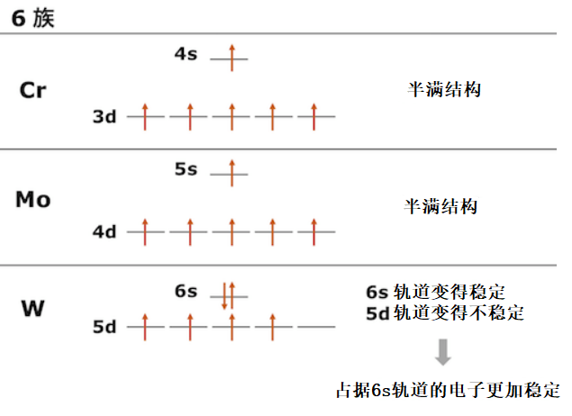 第6族的Cr和Mo具有半满d轨道的((n-1)d)5(ns)1稳定的电子构型。然而,作为第三过渡金属的W打破了d轨道半满的情况,采用了(5d)4(6s)2的电子构型。这是由于相对论效应导致d轨道不稳定,s轨道稳定,因此在s轨道上放置两个电子比放进d轨道形成半满结构更加稳定。