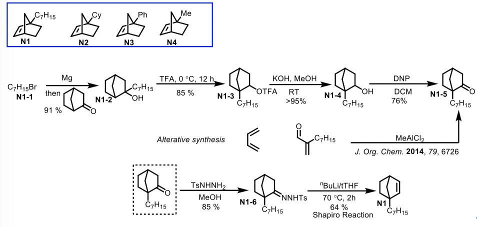 降冰片烯N1的合成[2](Scheme 1)。首先采用烷基卤代物制备的Grignard试剂与降樟脑 (norcamphor)进行亲核加成反应,形成相应的三级醇砌块,再依次经历非经典碳正离子的重排、去保护以及DNP氧化,构建起关键的中间体N1-5(N1-5同样能够通过1, 4-丁二烯与共轭烯酮之间的D-A反应一步构建[3])。中间体N1-5与肼形成相应的腙砌块,并进一步经历后续的Shapiro反应,最终完成降冰片烯N1的合成。 其他类型的降冰片烯分子N2-N4可采用类似的反应策略进行合成。
