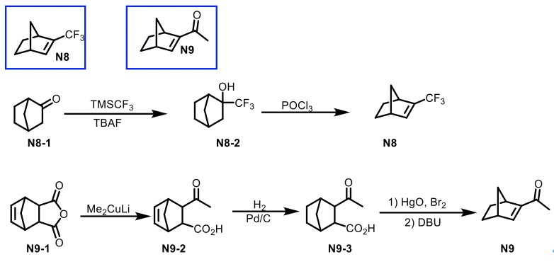 降冰片烯N9可通过N8-1与TMSCF3的加成以及三氯氧磷存在下的消除反应过程进行合成[7]。而N9则依次通过N9-1砌块与Gilman试剂之间的加成消除、氢化、脱羧溴代以及消除的四步反应路线进行合成[8](Scheme 4)。