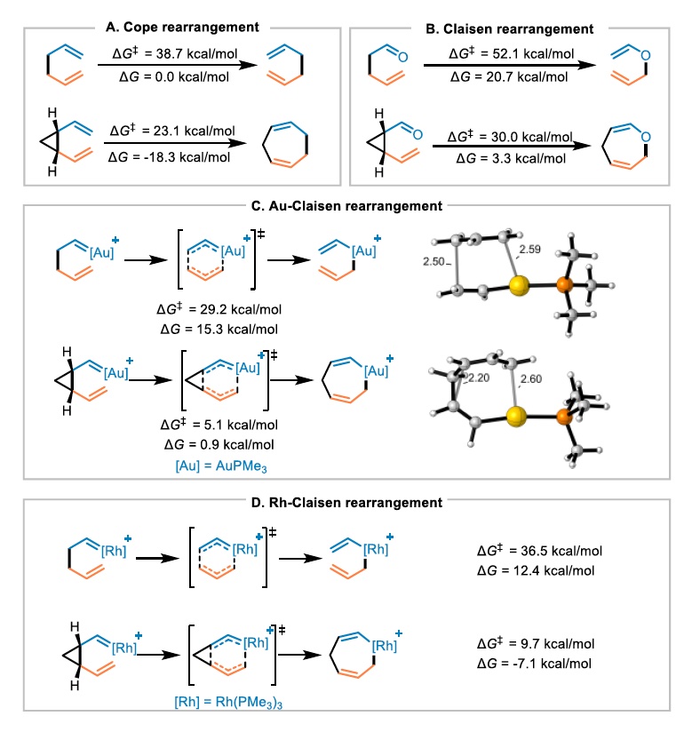 图1:传统Cope与Claisen重排以及金属杂Claisen重排反应(图中活化自由能等数据来自DFT计算)。图片来自Angew. Chem. Int. Ed.