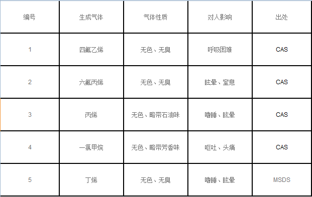 就文章开头的新闻报道,小编在这里整理介绍在神奈川县进行的加热实验内容,可以发现结果还是很令人震惊的。实验中中对含氟树脂的平底锅单纯地加热,发现有气体产生,由GC-MS分析检测,结果显示产生了如下的气体: