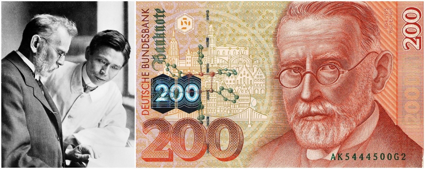 图 5 保罗•埃尔利与秦佐八郎合照及纪念保罗•埃尔利的纸币