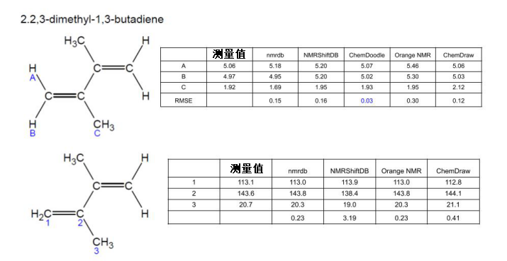 让我们来比较下各类预测服务的预测准确度吧。测量值来自SDBS数据库,所用的ChemDraw为18.0版本。化学位移的误差值用RMSE(均方根)表示。因为ChemDoodle的使用次数有限,所以不能全部预测完。