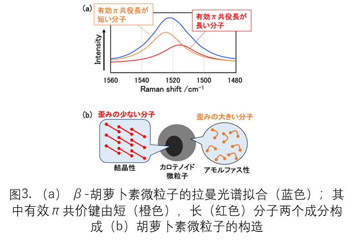 接下来,假设构成每个域的分子会发生不同的扭曲,并进行拉曼光谱分析。在类胡萝卜素拉曼光谱中,基于拉曼光谱的峰位置可获得的有效π共轭长度来估计分子畸变程度。首先,在块状晶体中,得到与类胡萝卜素分子多烯的理想共轭双键数(番茄红素10个,β-胡萝卜素,虾青素9个,叶黄素9个)对应的光谱,细颗粒中的类胡萝卜素分子没有发生扭曲。另一方面,类胡萝卜素颗粒的光谱分析(图 3a)表明它们含有与块状晶体具有相同有效 π 共轭长度的未扭曲分子和具有比块状晶体更短的有效 π 共轭长度的扭曲分子(图3b)。