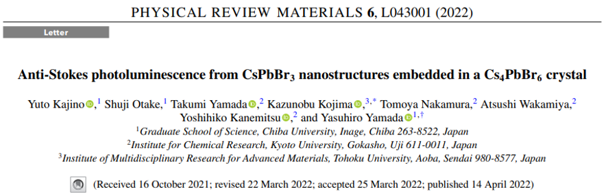 2022年4月20日,千叶大学山田泰裕(Yasuhiro Yamada)教授课题组在专业杂志Physical Review Materials上在线发表了题为「Anti-Stokes Photoluminescence from CsPbBr3Nanostructures Embedded in a Cs4PbBr6Crystal」的科技论文,该研究在钙钛矿结构晶体CsPbBr3中观察到了Anti-Stokes发射效果,并期待它可作为一种很有前途的光学冷却材料被应用。