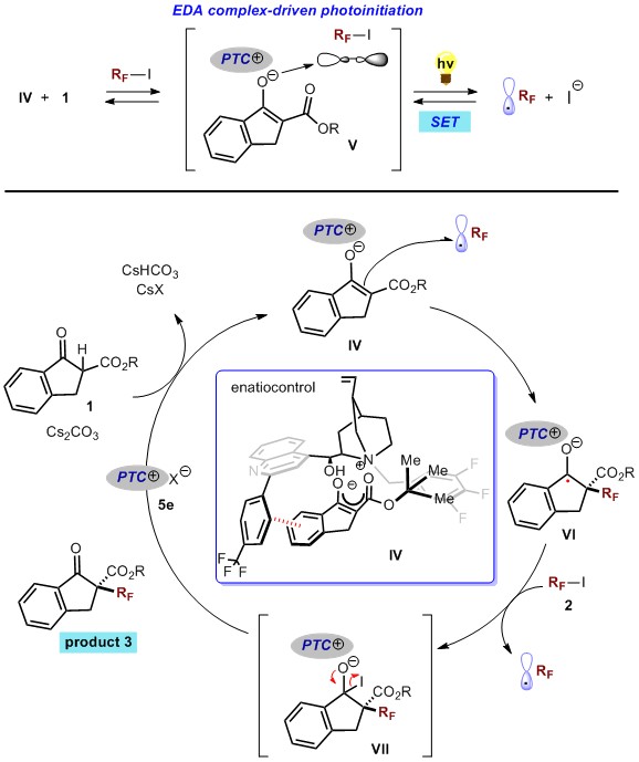 对于该反应得机理,论文中基本已经给出,但是小编认为其中有个小错误,小编在这边已经自我纠正。另外其手性中间体小编也通过查阅文献在中间给出了小编的理解。首先羰基α位的酸性proton被碱脱去形成enolateIV,在这里PTC相转移催化剂有两个作用,最明显的就是稳定enolate anion,还有一个就是形成手性离子中间体IV, 而该中间体与碘化全氟烷混合后,enolate anion与全氟碘化烷基形成halogen键,并且enolate 氧的电子转移到全氟碘化烷基的sigma反键轨道,进行活化该轨道形成EDA complex中间体V,吸收波长发生红移,吸收可见光能量发生单电子转移(SET),诱发形成最关键的全氟烷基自由基。然后与中间体IV反应形成VI, 在这里有个小问题就是VI到底能不能与全氟碘化烷进行单电子转移再生全氟烷基自由基,如果是这样,那么一旦反应诱发后,因为全氟烷基自由基可以通过中间体VI再生,所以就不需要光照就能自发进行。所以在这步,编者对作者给出的机理解析有点疑问。接下来就是如图所示的消除脱去碘得到产物。