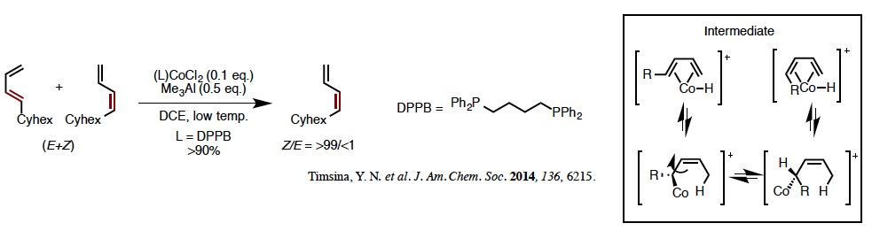 最终产物几乎全是Z型的生成物、这是由于立体位阻(1,3烯丙基张力)使得s-cis型不容易得到,无法形成Co络合物中间体(参见图2右栏中钴与1,3-二烯四个(碳)原子配位得到的中间体的平衡混合物)。E型(左上)优先反应,转化为Z式(右上)、从反应结果上看几乎全部转化为Z型双烯,看来Z型选择性异构化反应还是存在的,只不过底物适用范围仅限于1,3-二烯。