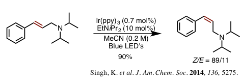 Ir(ppy)3作为有效的光敏试剂(光催化剂)、实现光照异构化的研究也有报道。各种各样的烯烃的Z型异构化是有可能的,但是反应中个必须用到昂贵的高价铱络合物。