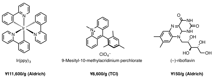 - 常见的有机光催化剂Acr-Mes(9-Mesityl-10-methylacridinium perchlorate)是¥8,600JPY/g(TCI)、