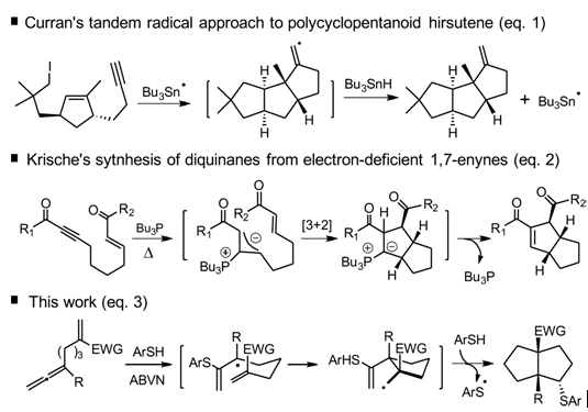 在天然物中,具有多个连续手性中心的多环天然产物非常多(Fig.1),这些结构常常是合成工作中的难点。在此前,Curran课题组曾报道过一种锡烷引发的自由基串联环化反应生成三个并环化合物(ref.1),其过程是引发剂nBu3SnH将炔转化成烯烃自由基,再经过两次成环得到具有四个连续手性中心的5,5,5-三环结构骨架(Fig.2-eq.1)。此外Krische课题组在2005年也开发过一种分子内[3+2]环加成反应(ref.2)成形成5,5-二并环骨架(Fig.2-eq.2)。