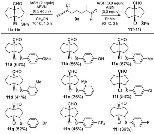 首先是引发反剂的筛选(Tbl.1),测试中的溶剂有甲苯,CCl4,DCE,CH3CN,同时改变引发剂的种类和剂量AIBN/ABVN(0.1/0.2equiv.)和硫酚PhSH的剂量(2/5equiv.),多次试验之后得到最优化反应条件:CH3CN为溶剂,0.2equiv.ABVN和2equiv.PhSH做自由基引发剂,此条件下产率可高达70%。