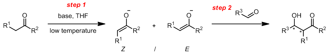 一般来讲,在热力学的条件下,Z-烯醇倾向于得到syn-aldol产物,而E-烯醇倾向于得到anti-aldol产物。