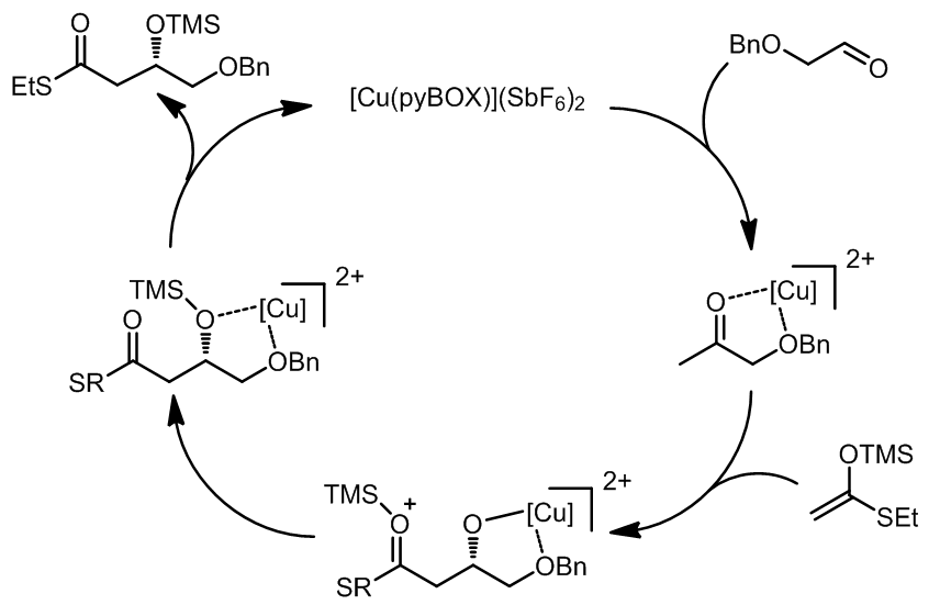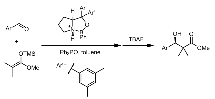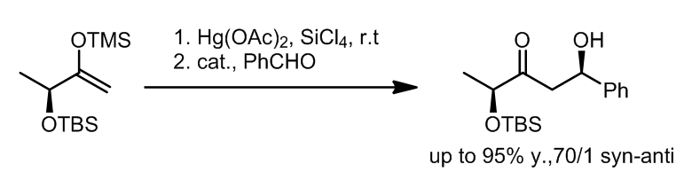 Danmark开发了一种利用Lewis碱催化的硅烯醇醚参与的aldol反应,并且反应不需要金属的参与,反应研究发现使用极性溶剂可以加速反应的速率,提高反应的效率。例如: