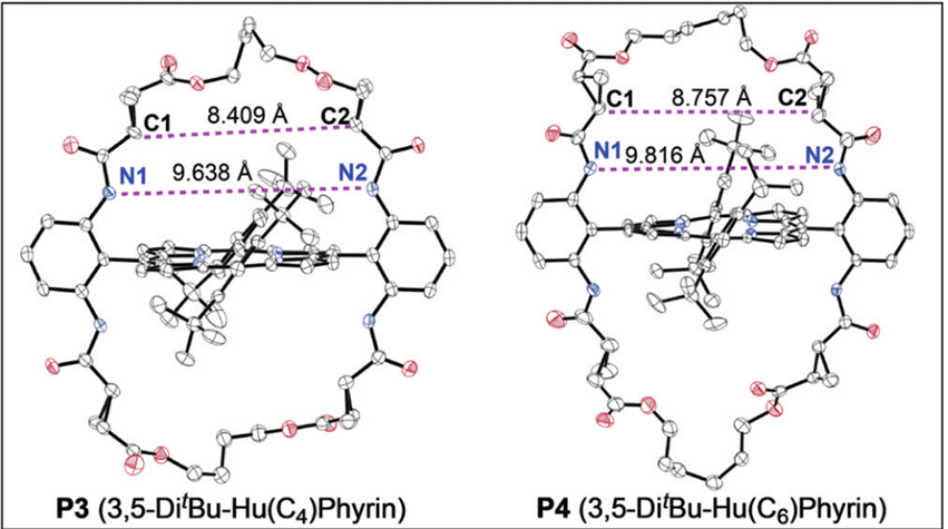 所得到的穴状卟啉配体和相应的口袋状配体随后进行核磁共振氢谱和X-ray表征,探讨此链状结构对卟啉配体构象的作用。由H-NMR可知,由两根C-C键自由旋转可导致的氢谱中氢信号(Ha和Hb)的宽度有明显缩小,穴状配体的峰形也更加尖锐,说明穴状卟啉配体有更加刚性的结构。而P3与P4相比,其Ha的峰宽更窄,说明P3的环骨架更加更加刚性。