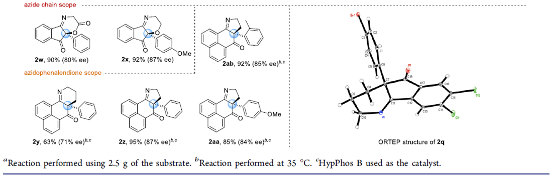 紧接着,在最优反应条件下,作者对该不对称Staudinger-aza-Wittig反应的底物范围进行了考察(Scheme 2)。将3-叠氮丙基茚二酮季碳手性中心的苯基换成各种取代的芳基、杂环以及甲基、乙基、异丙基、烯丙基、苄基、环戊基、环己基、环庚基均能较好的适应反应条件,能以良好至优秀的收率和对映选择性得到相应产物。将茚二酮部分的苯基换成萘基以及吸电子的芳基,这些底物也具有良好的耐受性,能以能以良好的收率和对映选择性得到相应产物。但将茚二酮部分的苯基换成给电子的芳基,则反应的对映选择性有所降低。叠氮链中插入醚和酯基,反应也能较好的进行。此外,通过该反应还可有效地构建四氢吡啶和二氢吡咯骨架的化合物。