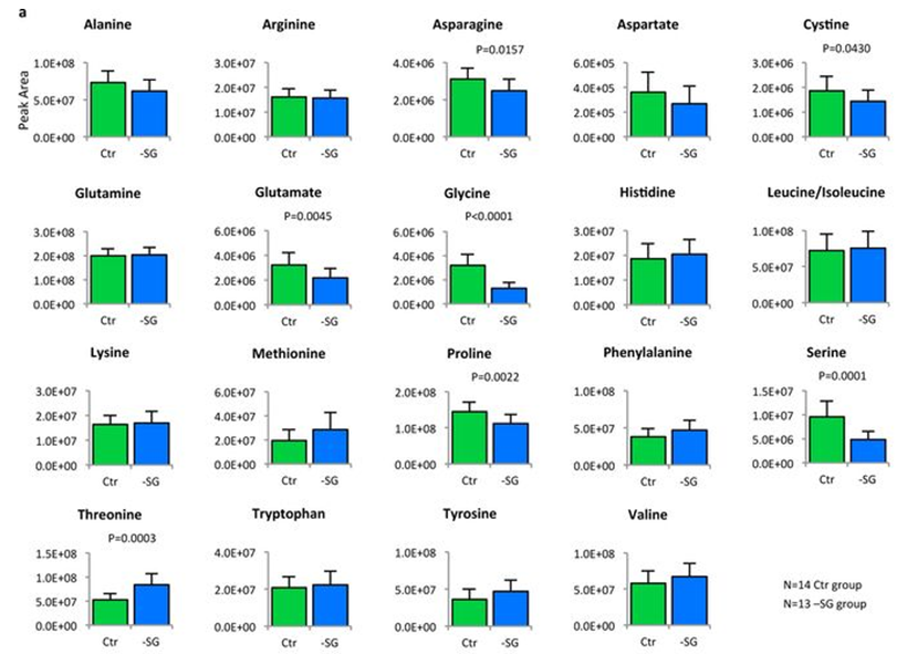 实验中剔除两种氨基酸后的肿瘤细胞内,Gly和Ser的含量,相对于控制组的肿瘤细胞内氨基酸含量来说明显少很多。事实上,这两种氨基酸的含量,相比于正常饮食的小鼠肿瘤细胞来说,是最少的两个氨基酸(Gly和Ser的P值最小)。
