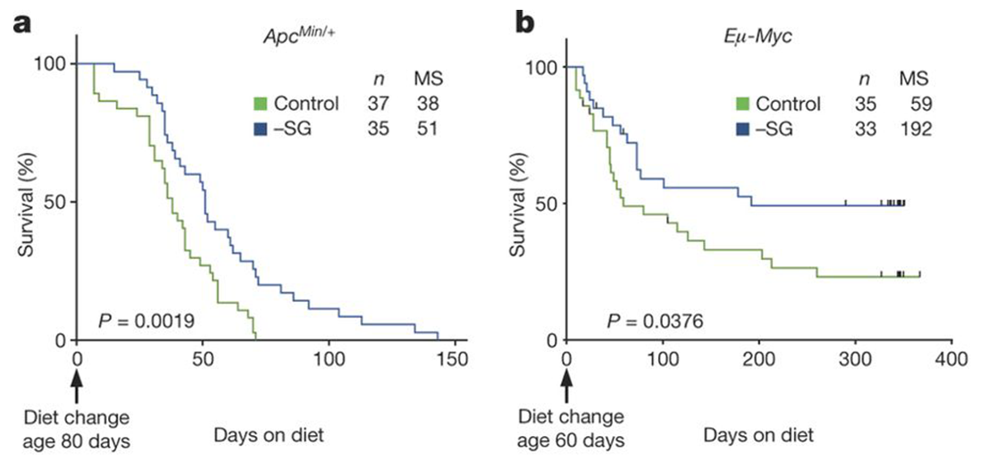 图1实验所用小鼠为基因工程编辑过的罹患癌症的小鼠。其中a图小鼠为淋巴癌(由Myc激活驱动,Myc是一种癌基因),b图小鼠为肠癌(由Apc失活驱动,Apc是一种抑癌基因)。绿线为实验组,在饮食中剔除甘氨酸和丝氨酸(Gly和Ser);蓝线为对照组,饮食中含有Gly和Ser,其他事物完全一样。很明显可以看出,剔除掉Gly和Ser之后,罹患两种癌症的小鼠其生存期均长于对照组。
