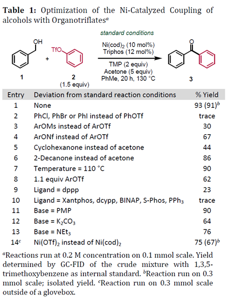 以苄醇1和三氟甲磺酸苯酯2为模板底物,作者对反应条件进行反复筛选,确定最优条件(Table 1):10 mol% Ni(cod)2和12 mol% Triphos为催化剂,TMP为碱,5 equiv丙酮为氢受体,甲苯为溶剂,在130 ℃条件下反应20 h,能以93%的收率得到相应产物。