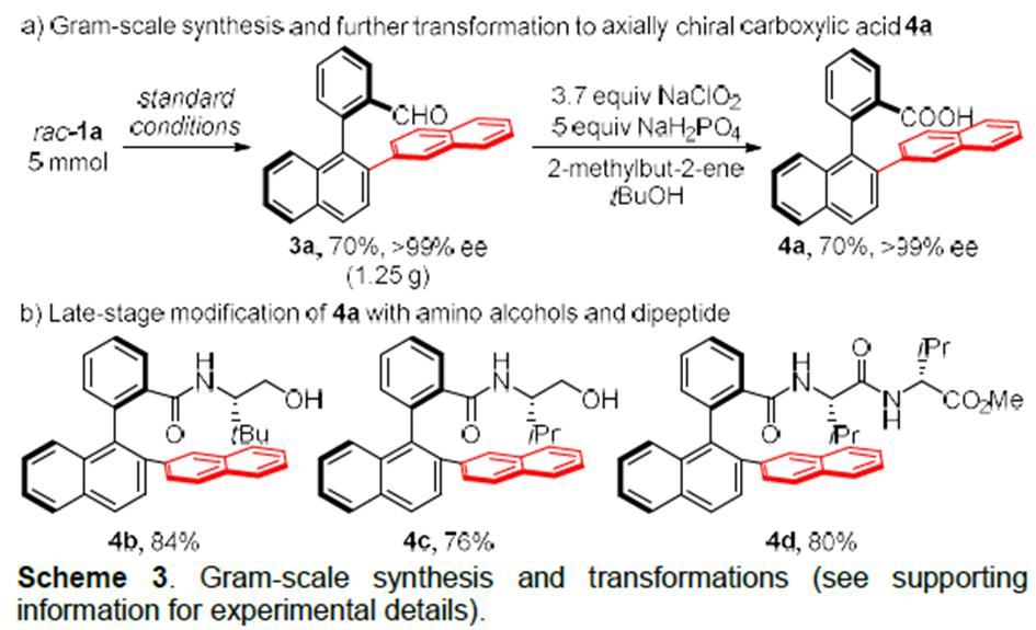 为了证明该反应的应用潜力,作者又进行了克级反应及衍生反应(Scheme 3)。将rac–1a的量增至5 mmol,在标准条件下反应,该反应的收率和对映选择性与模板保持一致。得到的产物3a可被氧化成相应的羧酸4a。4a可以进一步转化为带氨基醇和二肽的轴手性二芳基化合物。