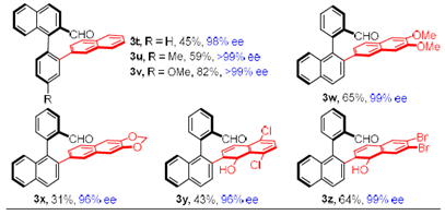 在成功的获得产物3后,作者经过条件筛选,最终通过3步C-H官能团化反应,能以良好至优秀的收率和优秀的对映选择性得到郭氏轴手性醛(Scheme 4)。