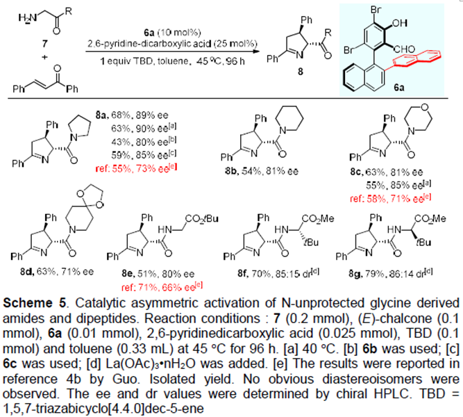 上述步骤中得到的手性醛催化剂6可用于催化(E)-查尔酮和甘氨酸衍生的酰胺或二肽7的不对称反应(Scheme 5)。其中,6a的催化效果最好。同时,在该催化体系下,哌啶,吗啉,1,4-二氧杂-8-氮杂螺[4.5]癸烷衍生的甘氨酰胺具有良好的耐受性,均能以良好的收率和对映选择性得到相应的产物8。
