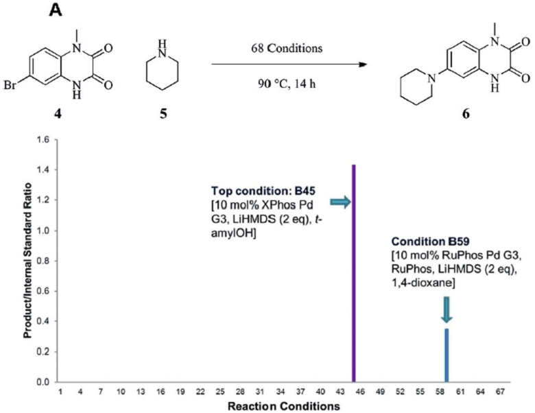 另外一个案例是二酮4和哌嗪的C-N偶联反应,如图4所示,作者设置了68种反应条件,但只有2个有产物,它们的共同点是实用了LiHMDS这个碱,说明碱的作用非常重要,为更快筛选反应条件,作者使用了流动化学技术,并将原来68种条件的碱全部更换为LiHMDS,其中>80%得到了产物,优化后的反应条件为TB43,反应规模放大到50mg后,分离产率为67%,这再次说明了,将反应条件扩展到所有常见的反应试剂后,才能提高找到合适反应条件的成功率。