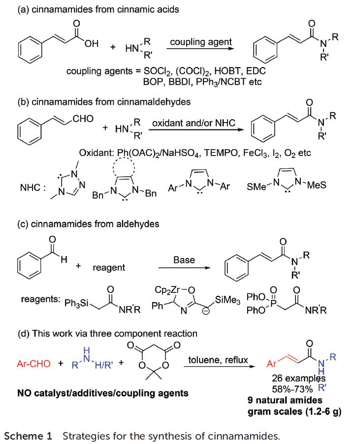 作者报道了一种三组分(醛、胺和麦氏酸)一步合成多种肉桂酰胺和胡椒酰胺类衍生物的方法,该方法收率高于大部分已知文献。同时,该反应无需使用任何偶联剂、氧化剂或催化剂等,符合原子经济化的标准,引入麦氏酸作为底物,副产物仅有CO2和丙酮。该方法为合成具有医学价值的肉桂酰胺衍生物提供了重要的参考价值。