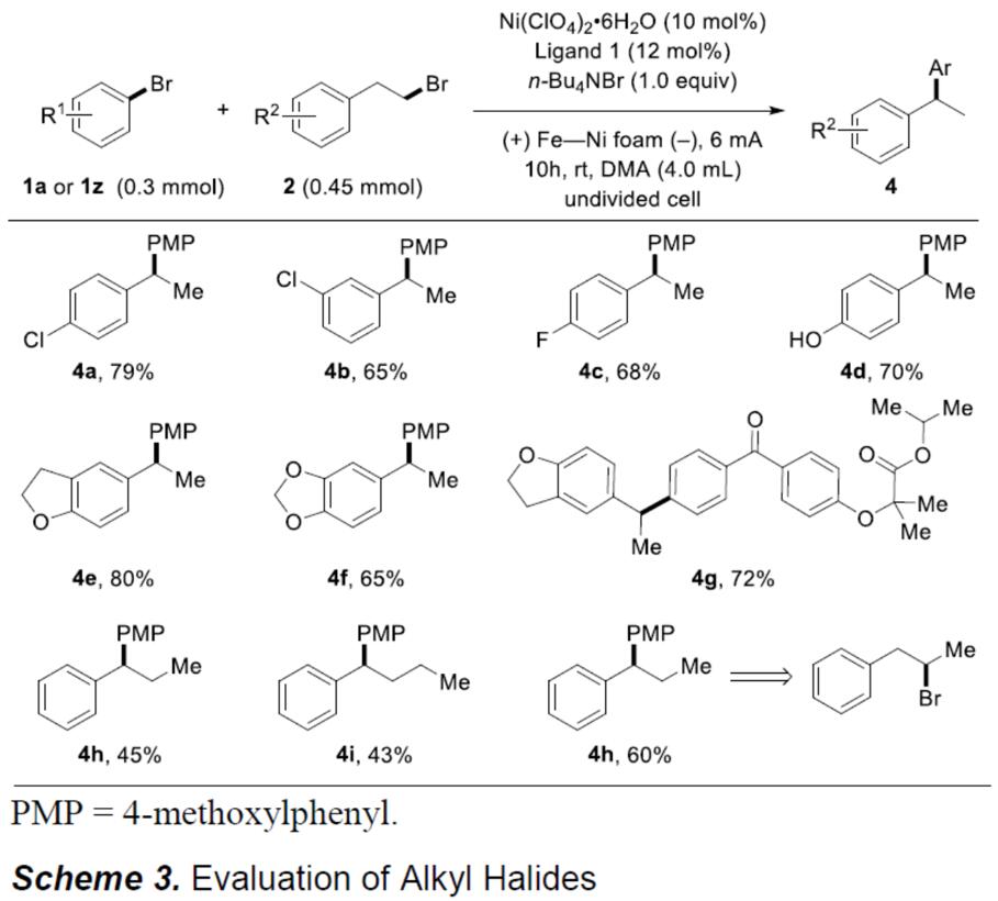 接下来,作者开始对溴代烷基底物2的范围进行了研究(Scheme 3)。反应结果表明,溴代烷基底物被各种官能团,例如氯、氟、醚和羟基等,在标准反应条件,均可获得相应的偶联产物(4a–4g)。而当使用三或四个碳链时,反应依旧可以进行,但收率略有降低(4h、4i)。此外,在标准条件下,即使溴代仲烷基也与体系兼容,获得令人满意的4h偶联产物。