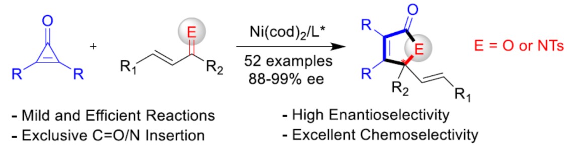 陕西师范大学李兴伟教授课题组报道了Ni(0)催化下,实现环丙烯酮与α,β-不饱和酮/亚胺的化学和对映选择性[3+2]环加成反应,该反应涉及环丙烯酮C-C键断裂和羰基/亚胺基的对映选择性官能团化。通过分子间C-C键活化,获得高对映选择性(88-98%的ee)的γ-烯基丁烯酰胺和内酰胺衍生物。同时具有原子经济性、高化学选择性和对映选择性等优点。